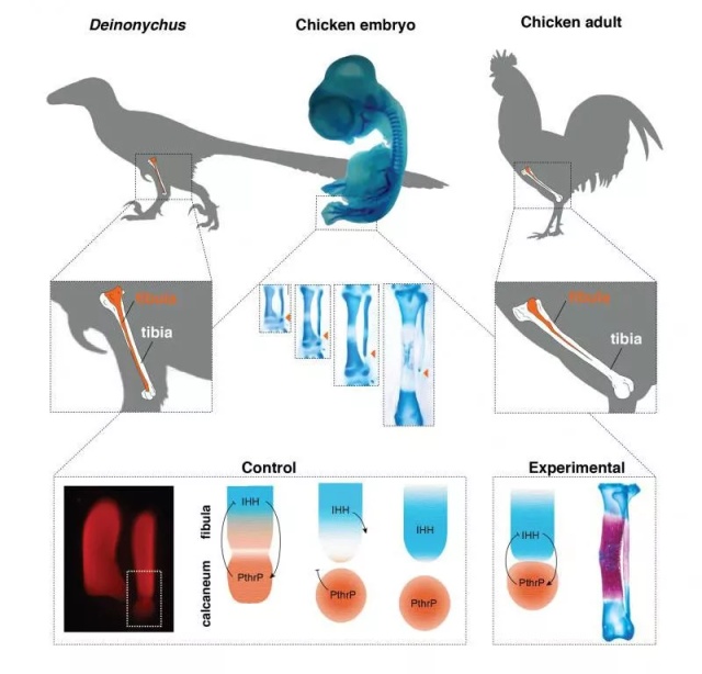 恐龍的腓骨(fibula,橙色部分)會延長至膝關節(jié)踝處,而雞的腓骨則比恐龍的小得多,經(jīng)過改造雞的胚胎中也顯現(xiàn)了腓骨的邊長