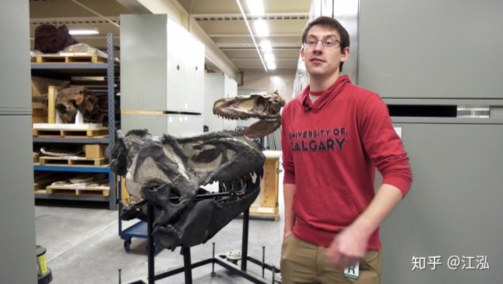 恐龍化石的發(fā)現(xiàn)還要追溯到十年前的2010年。約翰·德格魯特(John De Groot)是一位農(nóng)民兼古生物愛好者,一天他在和自己的家人沿著艾伯塔省南部的弓河(Bow River)河岸散步時,偶然發(fā)現(xiàn)了一些屬于大型肉食性恐龍的頭骨化石,于是他們趕緊聯(lián)系了皇家泰勒博物館(Royal Tyrrell Museum)。博物館很快就派來了專業(yè)人員對化石進行發(fā)掘。化石殘骸具有很明顯的暴龍科恐龍的特征,有可能是屬于一頭懼龍(Daspletosaurus ),因此標本也就沒有引起太多的關注,就先堆放到了倉庫之中。