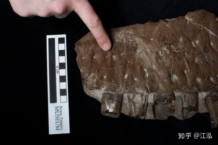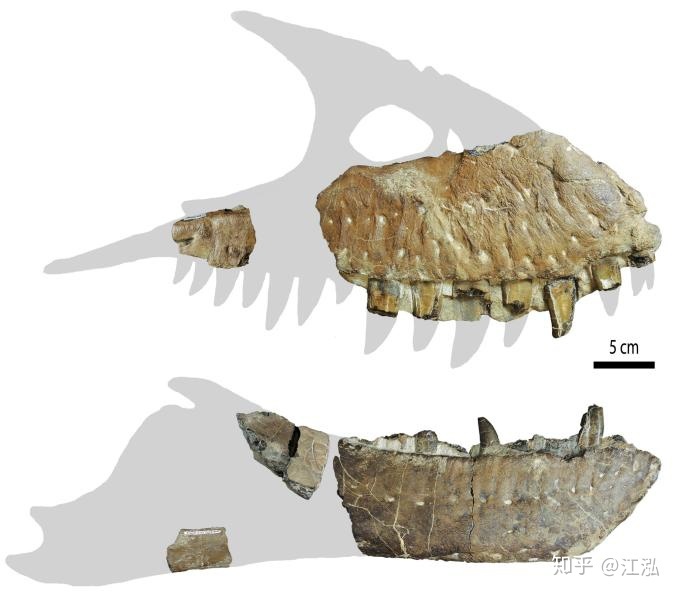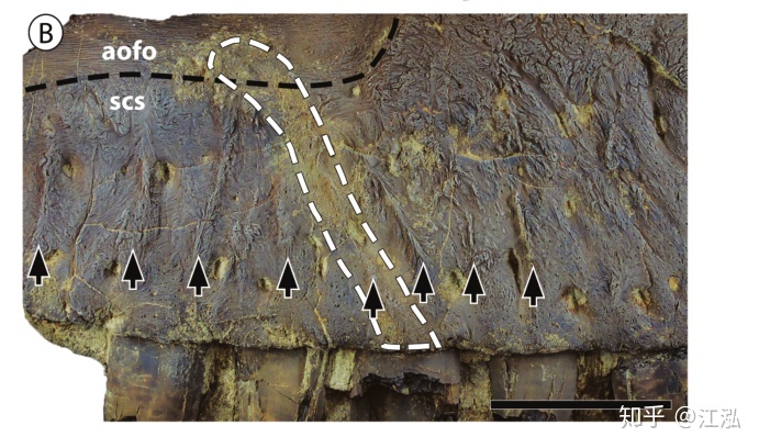 圖注:死掠龍頜骨上的傷(白色虛線)以及突起的脊(黑色箭頭)