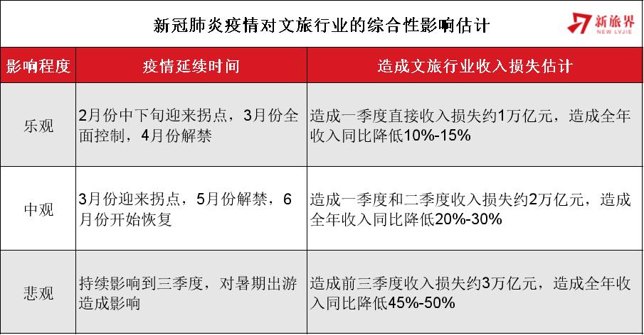 根據(jù)文旅部數(shù)據(jù)中心統(tǒng)計(jì),2019年春節(jié)假期全國(guó)旅游總收入達(dá)到5000億元,按春節(jié)假期收入占一季度收入50%-60%的比例估算,預(yù)計(jì)一季度總收入約8500-10000億元。另?yè)?jù)中國(guó)旅游研究院估算,2019年全年文旅行業(yè)總收入約6.5萬億元。由此估算,2020年文旅產(chǎn)業(yè)收入損失額度約1萬億元,會(huì)導(dǎo)致全年總收入同比降低15%。如果樂觀估計(jì)后三季度文旅消費(fèi)迎來高速增長(zhǎng),全年負(fù)增長(zhǎng)預(yù)計(jì)可以收窄到10%以內(nèi),如果后續(xù)有更大的利好,呈現(xiàn)出報(bào)復(fù)性反彈,負(fù)增長(zhǎng)會(huì)進(jìn)一步收窄。