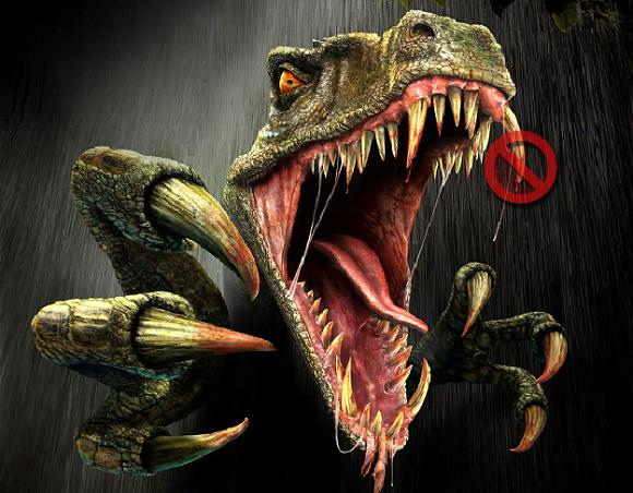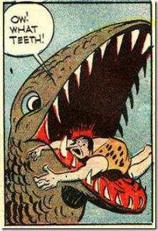圖一中的這只尖牙利爪目露兇光,稱A。圖二中這只同樣血盆大口但目光可愛仿佛因吃驚才長大了嘴巴的,稱B。雖然A風格細膩,生動傳神,貌似很逼真,但是那兩對長長的“獠牙”卻是犯了想當然的錯誤。哺乳動物里的獵手門都有尖長致命的犬齒,其中最深入人心的當屬劍齒虎,他上頜的那兩把利刃可謂犬齒的極致,但是在遙遠的侏羅紀,恐龍并沒有如此專事獵殺的牙齒。將今論古是需要保持謹慎的。事實上食肉類恐龍的牙齒正如漫畫B中所示:匕首狀,前后大小基本一致,而又參差不齊。