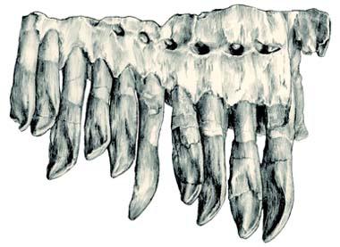 這些形狀各異的牙齒是怎樣工作的,要解決這個復雜問題,遠比推斷肉食恐龍難得多。因為他們跟現(xiàn)今的素食動物的牙齒實在相差太遠。這些有著明顯磨痕的牙齒可以進行原始的咀嚼嗎?各種答案中唯一可以肯定的是:如果他們能在一定程度上嚼碎樹葉,整個過程也是僅限于垂直方向。因為關節(jié)的構造說明了下頜無法在水平方向上運動。而且牙齒上的磨蝕面也證明了這一點。如果你認真觀察牛羊吃草或者反芻,會發(fā)現(xiàn)他的下頜左右晃動的很厲害。正是這種運動,配合臼齒寬大多嵴的咀嚼面,把草料充分磨碎。雖然近來的研究發(fā)現(xiàn)有些進步的鳥腳類(禽龍和鴨嘴龍類)已經(jīng)演化出比較進步的取食機制,也可以上下頜橫向移動,雖然沒有幅度那么大。咬合時,上頜斜向外,下頜斜向內(nèi),產(chǎn)生原始的“咀嚼”,但大多數(shù)恐龍只能用大量的牙齒上下相對的擠壓切割,把枝葉咬碎。