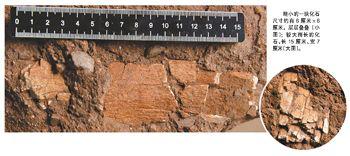 前日下午,連場暴雨過后,河源恐龍博物館館長杜衍禮與該館辦公室主任劉藝、副主任黃志青在京九鐵路附近、東源縣城萬綠春天住宅區(qū)與河源市區(qū)西邊交界處的一個(gè)工地里日常巡查時(shí),在一堆被挖土機(jī)推出來的亂石塊中,意外發(fā)現(xiàn)一塊紅砂巖中嵌有兩處史前生物骨骼化石,其中一塊略小的,尺寸約有6厘米 ×6厘米,層層疊疊的共有好幾層;較大而長的化石,長15厘米、寬7厘米。
