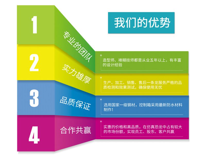 4.采用優(yōu)質(zhì)電機(jī)和電器元件控制恐龍展品動(dòng)作,達(dá)到經(jīng)久耐用動(dòng)作靈活協(xié)調(diào)的效果。