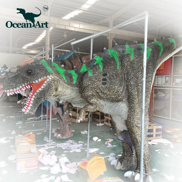 1.人控恐龍分為藏腿或露腿兩種設(shè)計(jì),服裝長約4米,重20千克。藏腿恐龍服在腿和腹部處有一條拉鏈,當(dāng)操作者穿好后,拉上拉鏈便可完全遮住身影;露腿恐龍服則會(huì)把操作者雙腿露在外面。尾部有一條可抽出的長桿,便于裝箱運(yùn)輸。另外,我們會(huì)提供一個(gè)支撐架,方便擺放恐龍服裝。