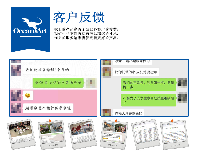 備注:我們注重展覽和產(chǎn)品本身的文化底蘊(yùn)及科技含量,并且關(guān)注產(chǎn)品與觀眾的互動(dòng)性、娛樂性和參與性,因此,我們先后推出了騎乘恐龍、打斗恐龍組、生蛋龍、蓋章恐龍、恐龍衣服等一系列,科技含量高,故事情節(jié)豐富,娛樂參與性極強(qiáng)的產(chǎn)品,深受廣大消費(fèi)者的青睞。除了產(chǎn)品的研發(fā)與制造,公司的營(yíng)銷核心是一套成熟的、創(chuàng)新性的展覽理念,并在海內(nèi)外都取得了廣泛的成功!