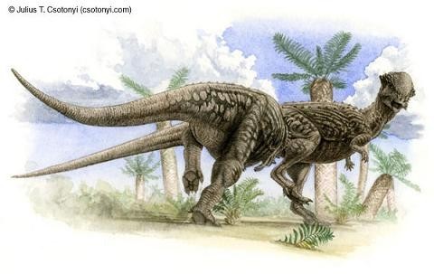 野牛龍生活在白堊紀(jì)晚期,大約6 米長、1米高,頭部有三只大角,脖子上有一個大頸盾,邊緣有齒狀骨質(zhì)突起。它是由山普森(Sampson)在1994年發(fā)現(xiàn)的三個頭骨化石命名的。像其它角龍一樣,它在獸群中穿行,有牙齒,能咀嚼最硬的植物。